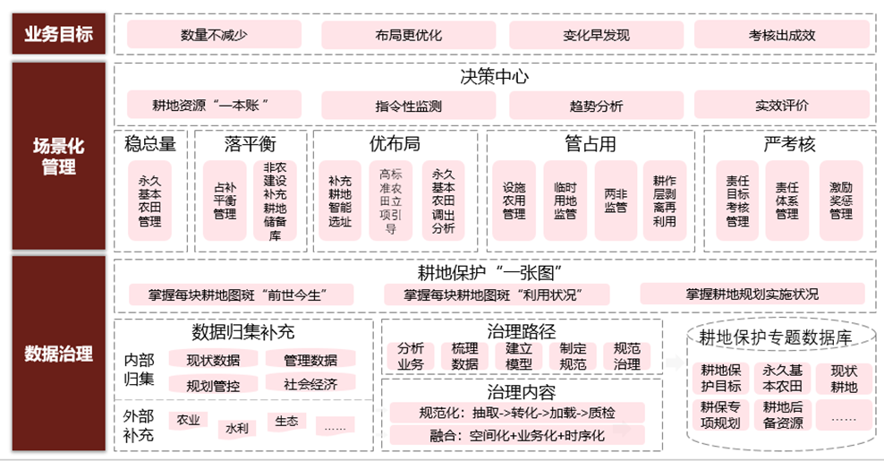 基于成熟方法論和工藝,構建從業(yè)務架構、體系關系到業(yè)務流程、業(yè)務服務的耕地保護業(yè)務治理體系框架,并成功應用于多個耕地保護制度研究及課題研究項目。