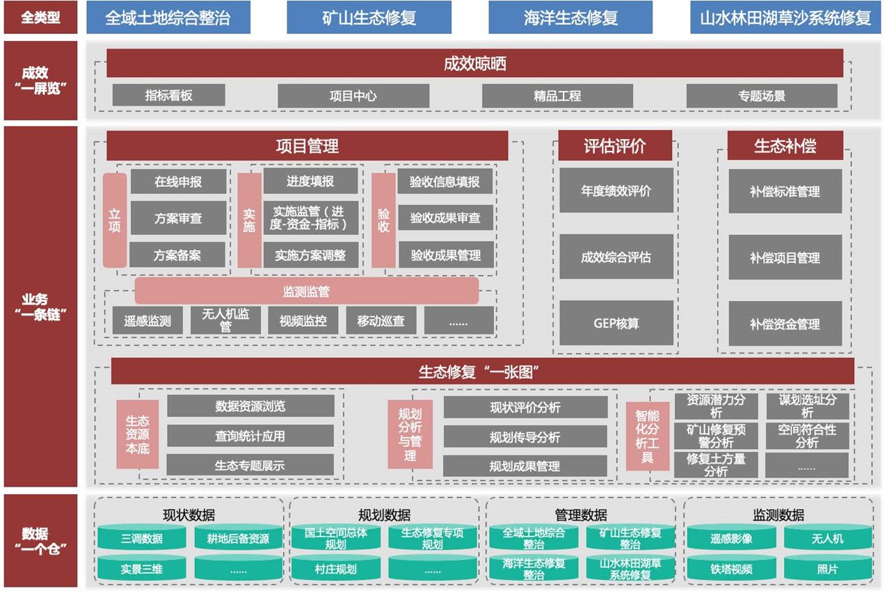 按照監(jiān)測“一張網(wǎng)”、數(shù)據(jù)“一個倉”、業(yè)務“一條鏈”和成效“一屏覽”的總體架構, 打造全類型全周期全方位的國土空間生態(tài)修復監(jiān)管系統(tǒng)。