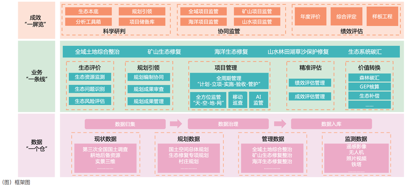以總覽生態(tài)格局、挖掘生態(tài)潛力、監(jiān)督項目進(jìn)展、評估實施成效、展現(xiàn)生態(tài)效益為核心,建立生態(tài)修復(fù)智治駕駛艙,以支撐科學(xué)管控,智慧決策。